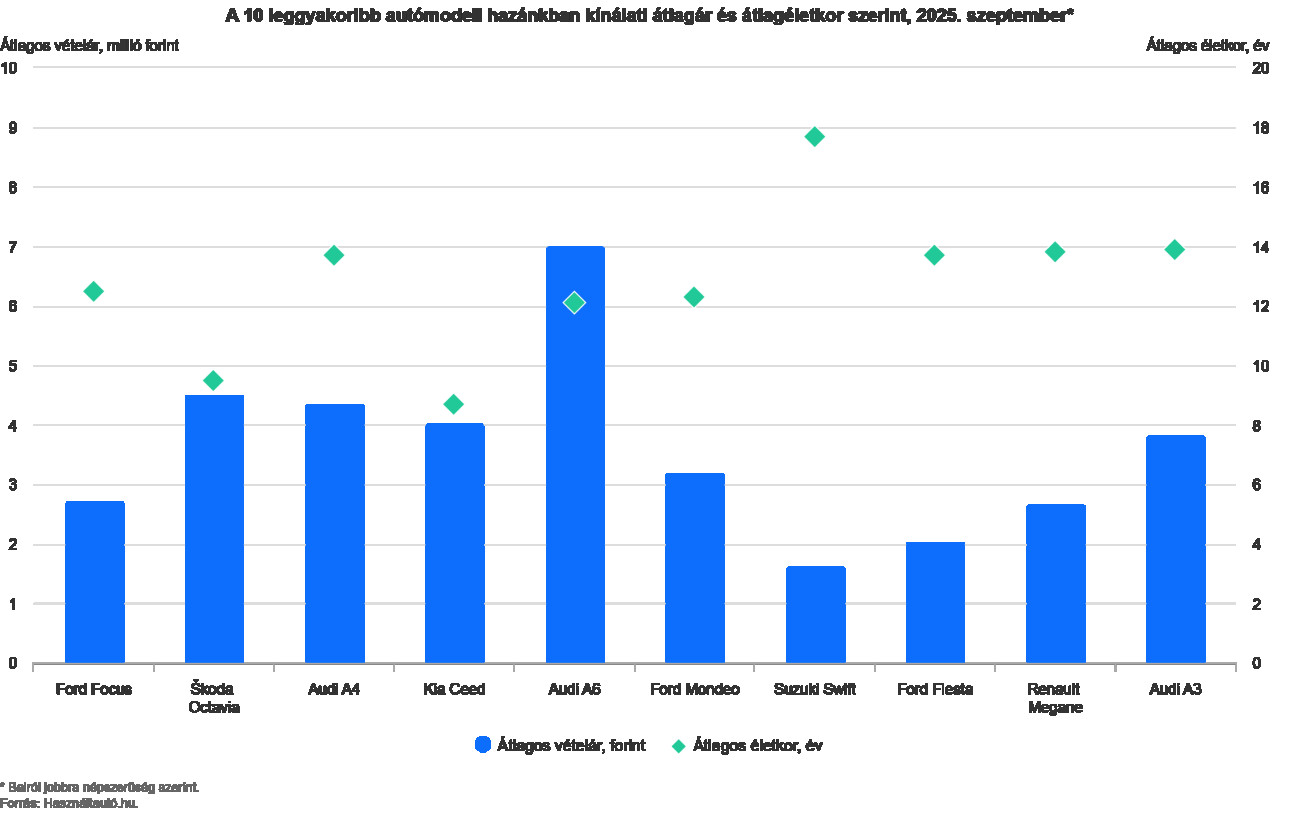 2025 szeptemberében a meghirdetett használt autók 38,3 százalékát 2,5 millió forint alatti áron kínálták, 26,8 százalékuk a 2,5–5 millió forintos kategóriába esett, 21,6 százalékukat 5–10 millió forint közötti áron hirdették, míg 13,4 százalék volt a 10 millió forint feletti árkategóriában.