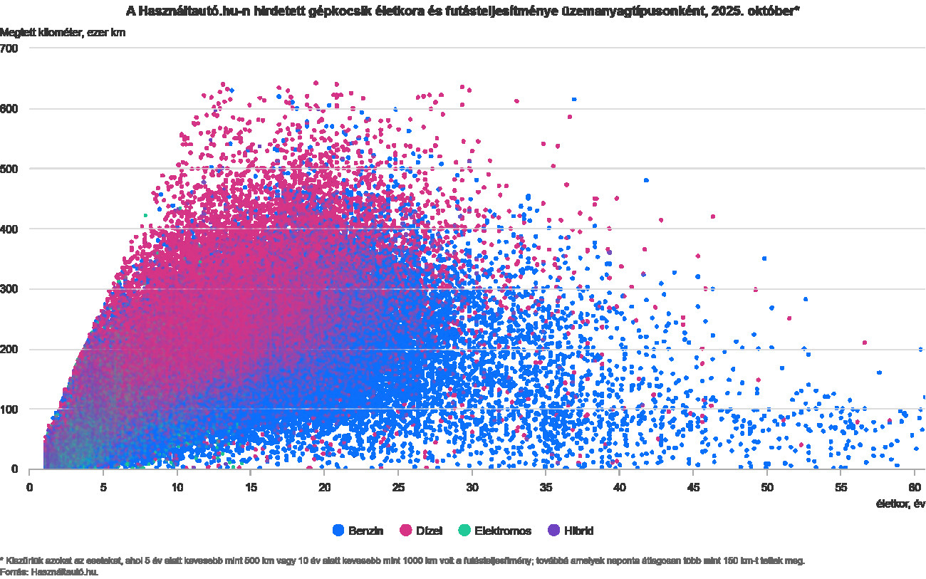 A benzines autók átlagéletkora 13,7, a dízeleké 12,2 év volt, és míg a dízelek futásteljesítménye kis mértékben nőtt, a benzineseknél stagnálást mutattak az adatok. A statisztika alapján a benzines autók minden egyes évvel átlagosan 6,9 százalékot, a dízelek 7,9 százalékot, az elektromosok 7,7 százalékot, a hibridek 6,4 százalékot, az egyéb meghajtásúak pedig 6,2 százalékot veszítettek az értékükből. Minden megtett ezer kilométer további 0,2 százalékos árcsökkenést eredményezett. A teljesítmény és hengerűrtartalom ugyanakkor jelentősen befolyásolta az árakat: utóbbi 100 köbcentis növekedése átlagosan 3,4 százalékos, míg minden plusz 10 kilowatt teljesítmény 3,7 százalékos értékemelkedést eredményezett. Az állapot szerinti különbségek továbbra is jelentősek: a kitűnő vagy újszerű autók több mint 20 százalékkal drágábbak voltak, miközben a sérült járművek átlagosan 60 százalékkal alacsonyabb áron szerepeltek.