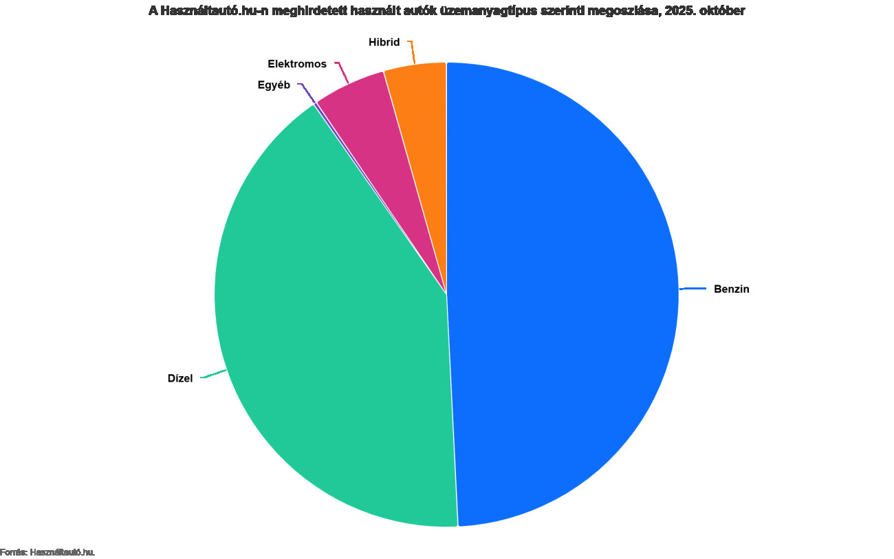 A legdrágább kategóriát a hibrid autók jelentik, amelyek átlagára 2025 októberében 11,91 millió forint volt. Ez a tavalyi értékhez képest 1 százalékos csökkenést jelent, ugyanakkor továbbra is ez a hajtástípus rendelkezik a legmagasabb kínálati árszinttel. Az elektromos autók átlagára 10,9 millió forintra mérséklődött, ami éves szinten 6,1 százalékos visszaesést mutat. A hagyományos hajtásláncok ennél jóval szerényebb árkülönbséggel szerepeltek: a benzines és dízel személygépkocsik ára közel azonos szinten mozgott, a dízelek átlagosan 5,6 százalékkal drágábbak voltak, mint a benzinesek.