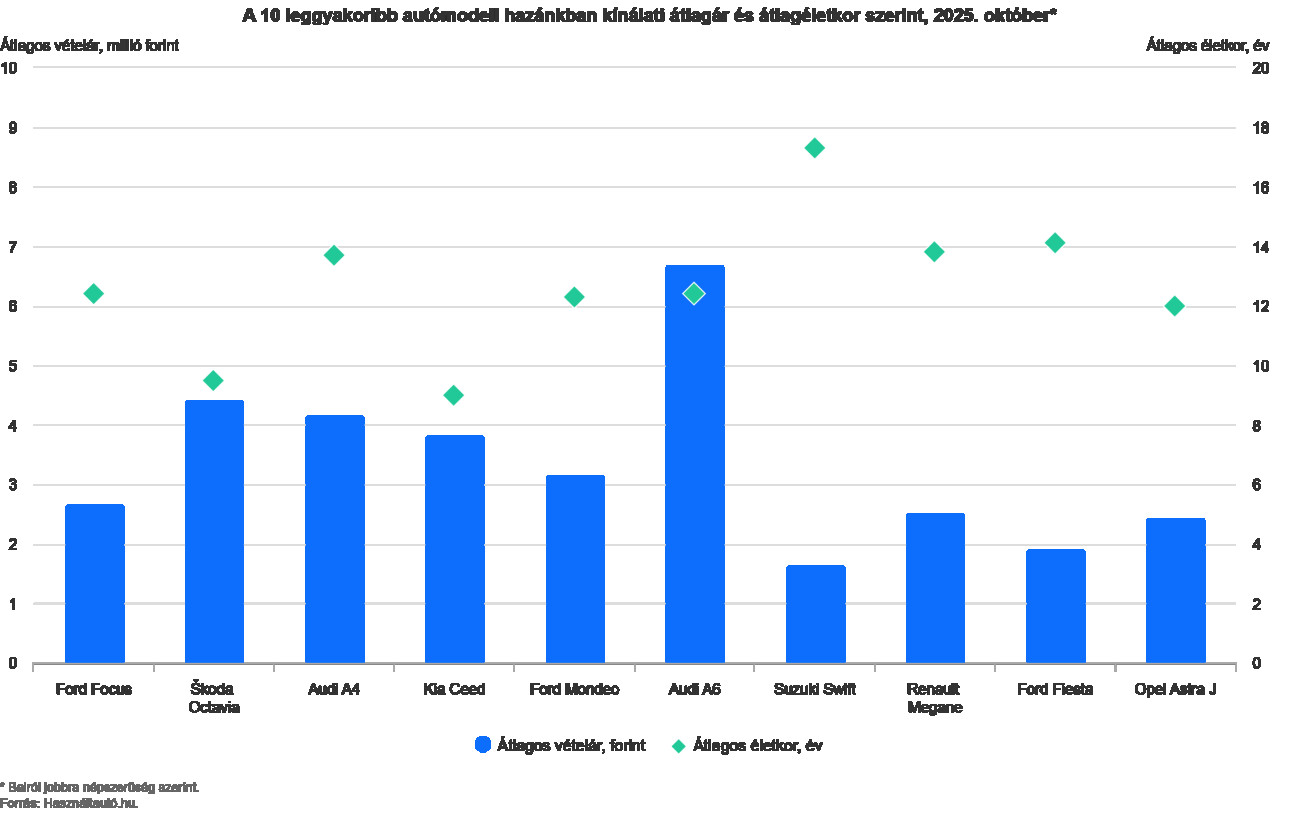 A tíz legnépszerűbb modell között az Audi A6 bizonyult a legdrágábbnak 6,7 millió forintos átlagárral, míg a Suzuki Swift a legolcsóbb volt, 1,65 millió forintos átlaggal. A Kia Ceed volt a legfiatalabb modell 9 év körüli átlagéletkorral, míg a Suzuki Swift közel 17,3 évvel vezette az idősebbek listáját. Az árváltozások között a Suzuki Swift mutatta a legnagyobb, 13,8 százalékos éves drágulást. Életkor tekintetében a legtöbb modell fiatalodott, kivéve az Astra J-t, amelynél stagnálást regisztráltak.
