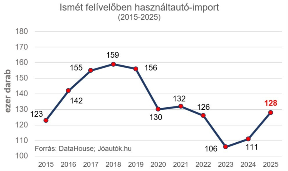 Tavaly a Datahouse adatai alapján 128 155 használt autó érkezett külföldről, ez 15,5 százalékkal több, mint 2024-ben – áll a Jóautók.hu közleményében.