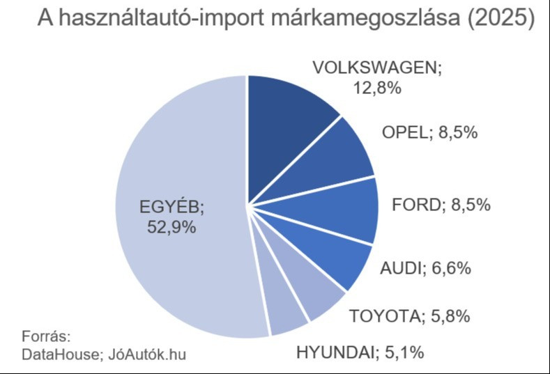 A Datahouse adatai szeint a 2025-ös márkarangsort 12,8 százalékos piaci részesedéssel a Volkswagen vezeti, majd az Opel és a Ford következik 8,5-8,5 százalékkal. Az Audi 6,6 százalékot, a Toyota 5,8 százalékot ért el, a hatodik helyre az évről évre erősödő Hyundai jött fel 5,1 százalékkal.