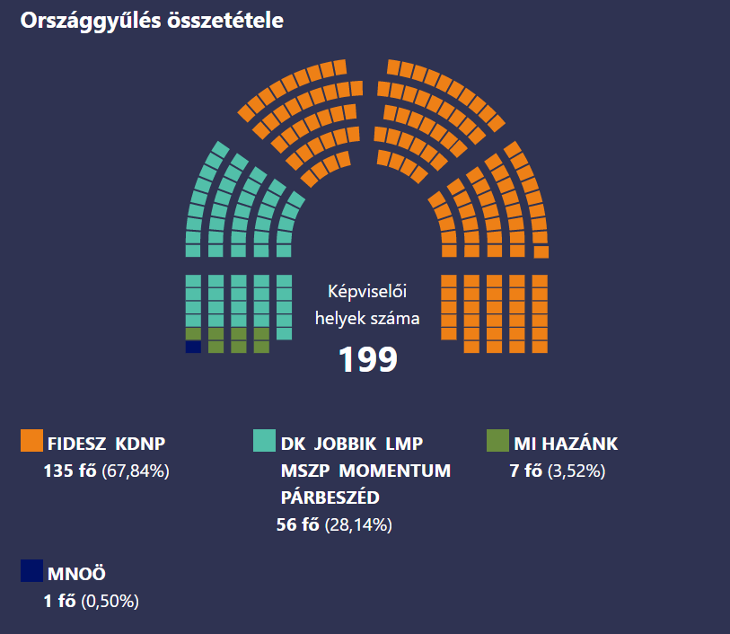 - a kormányerők 135 mandátumot szereznek (68 százalék)