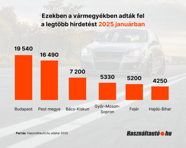 A portál adatai alapján 2025 januárjában az alábbi vármegyékben adták fel a legtöbb hirdetést a Használtautó.hu-n: