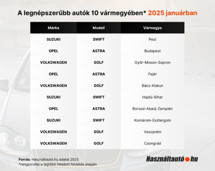 „Természetesen a legtöbb hirdetés Budapesten és Pest vármegyében jelent meg. Érdekes tendencia, hogy míg korábban Fejér vármegye előrébb járt, mostanra Győr-Moson-Sopronban több hirdetést adtak fel az előző év januárjához képest. A keresések száma is növekedett, Budapesten például csaknem 6 százalékkal. A vármegyénkénti bontás alapján a legnépszerűbb használt autók terén nincs meglepetés: a Volkswagen Golf továbbra is vezeti a mezőnyt, mögötte az Opel Astra és a Suzuki Swift következik” – emelte ki Koralewsky Márk, a Használtautó.hu üzletágvezetője.