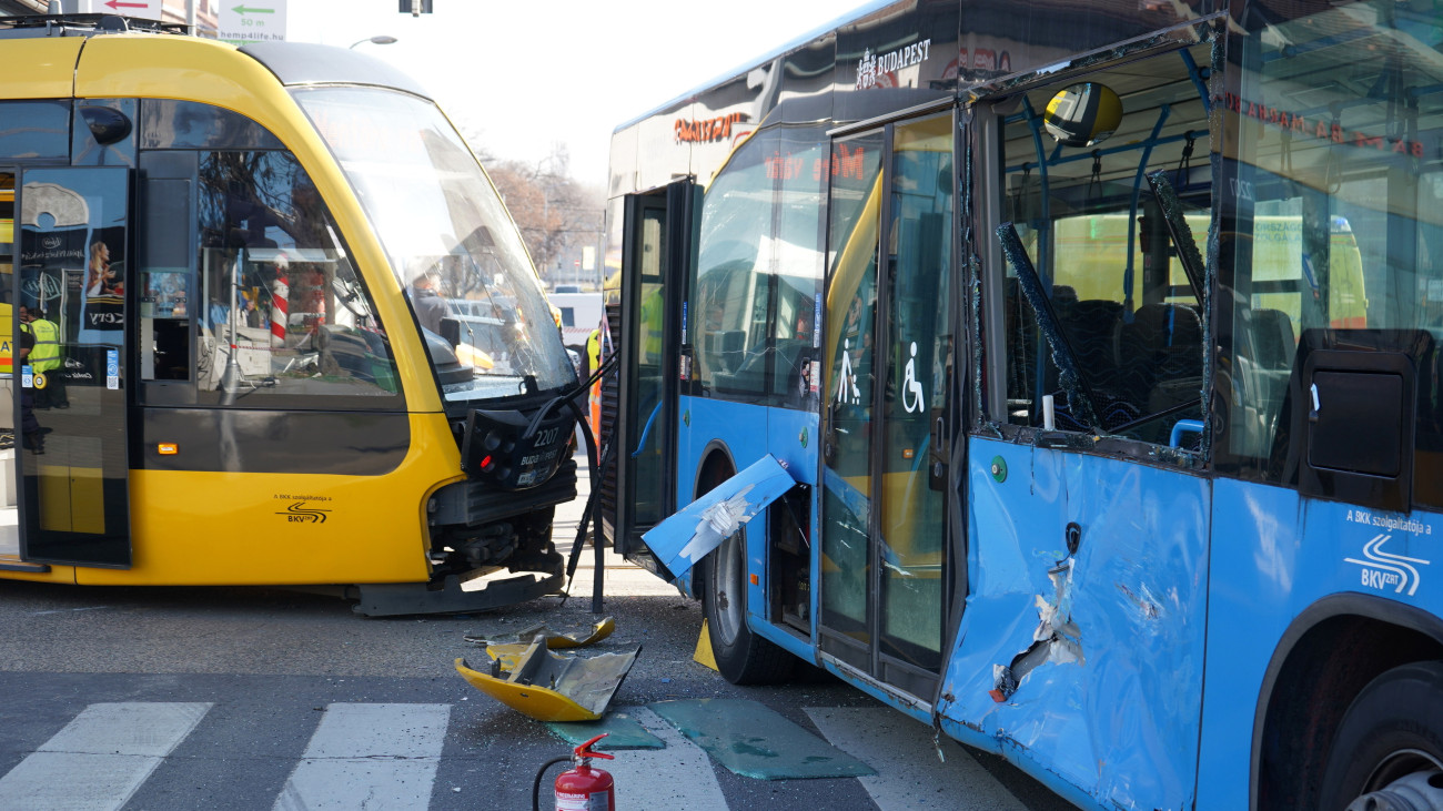 A Budapesti Közlekedési Központ tájékoztatása szerint öten sérültek meg, amikor összeütközött a 17-es villamos és a 29-es busz a Kolosy téren csütörtök délelőtt.