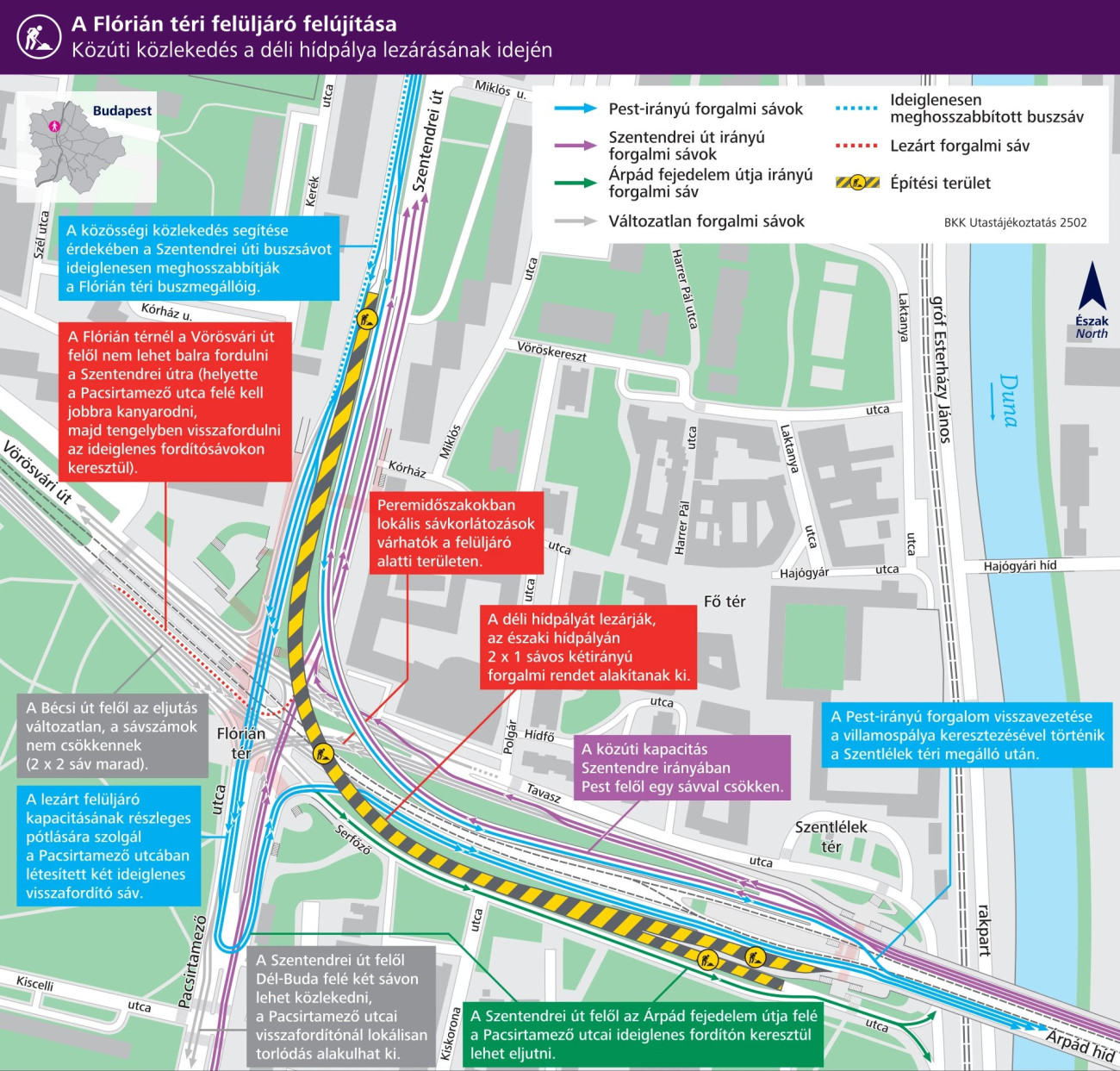A BKK szóvivője kitért a forgalmi változásokra is: alapvetően a legnagyobb változás azokat érinti, akik a Szentendrei út irányából haladnak Pest felé. Nekik két lehetőségük van, vagy mehetnek az északi felüljárón, ami a felújítás ideje alatt kétirányú, vagy átmehetnek a Flórián téri csomóponton, és a Pacsirtamező utca végében kialakított visszafordítót használhatják az Árpád híd felé.
