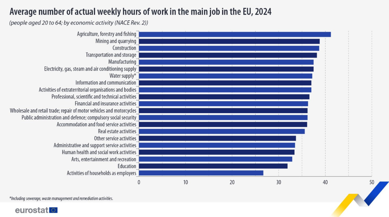 - a leghosszabb munkahetet a mezőgazdaság, az erdőgazdálkodás és a halászat (41,2 tényleges munkaóra),