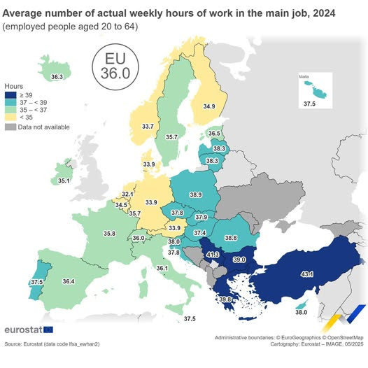 Ezzel szemben Hollandiában volt a legrövidebb munkahét (32,1 óra), ezt követte Dánia, Németország és Ausztria (egyenként 33,9 óra).