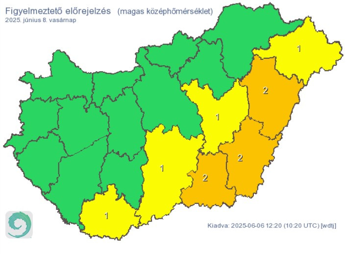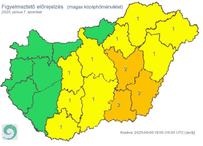 A meteorológiai szolgálat szombatra másodfokú (narancs) figyelmeztetést adott ki Csongrád-Csanád, Békés és Jász-Nagykun-Szolnok vármegye területére, a három vármegyében a napi középhőmérséklet 27 Celsius-fok felett alakulhat. Baranya, Tolna, Fejér, Bács-Kiskun, Pest, Heves, Borsod-Abaúj-Zemplén, Hajdú-Bihar és Szabolcs-Szatmár-Bereg vármegyében elsőfokú figyelmeztetés van érvényben, itt a napi középhőmérséklet 25 fok felett lehet.