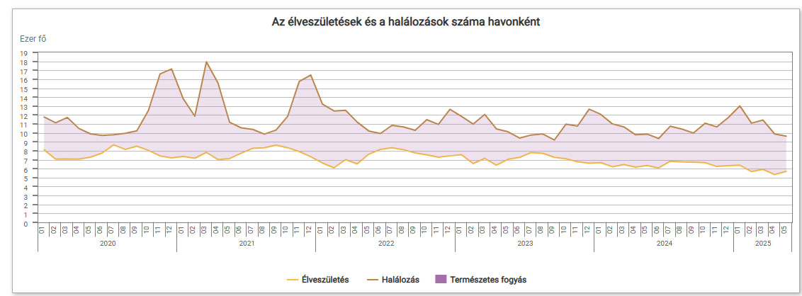 A közlemény szerint májusban 5696 gyermek született, 10 százalékkal, 654-gyel kevesebb, mint 2024 májusában. Ebben a hónapban 9639 ember vesztette életét, 2,3 százalékkal, 226-tal kevesebb az egy évvel korábbinál. A természetes fogyás a 2024. májusi 3515-tel szemben 3943 fő volt.