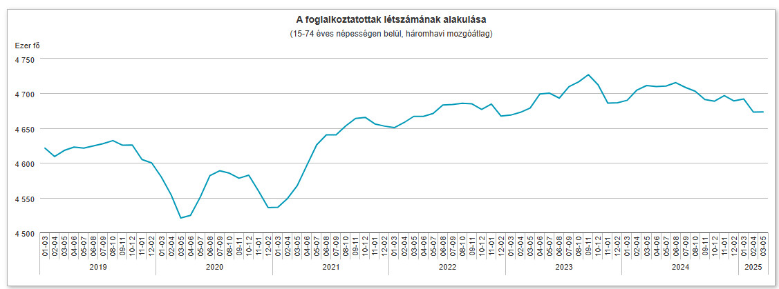 A 2025. március-májusi háromhónapos időszakban a foglalkoztatottak átlagos létszáma a 15-74 évesek körében 4 millió 673 ezer volt, 38 ezerrel kevesebb, mint egy évvel korábban. A férfiak körében a foglalkoztatottak száma 18 ezerrel, 2 millió 478 ezerre, a nőké 20 ezerrel, 2 millió 195 ezerre mérséklődött.