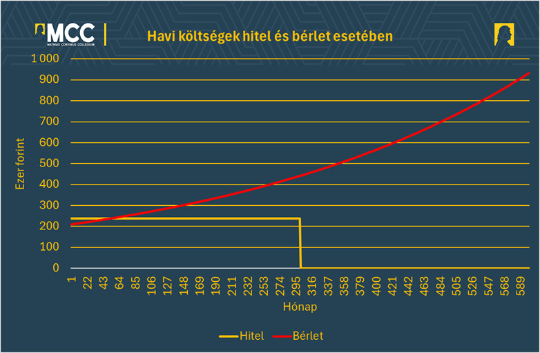 Ám ez az összefüggés az 52 hónapban, azaz kicsivel több mint 4 év után megváltozik. Innentől a folyamatos infláció miatt a lakásbérlet már magasabb havi költséggel jár, mint a hitel törlesztése. És ez a különbség egyre nő.