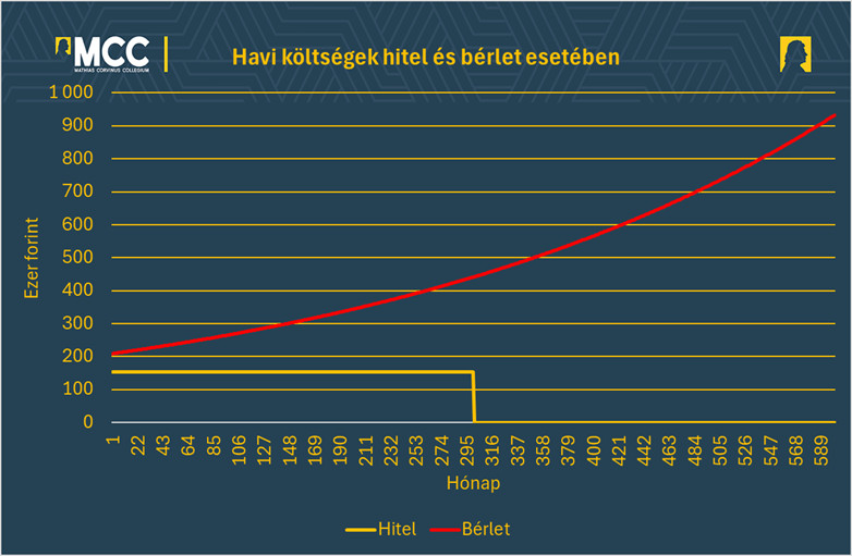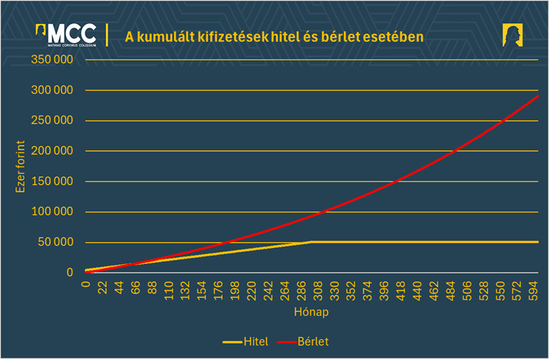 Innentől a bérlet anyagi hátránya folyamatosan csökken. Ha a teljes 50 éves futamidőt nézzük, akkor a hitelt választó fiatal összesen 51 millió forintot költött a kezdetben 55,6 millió forintba kerülő ingatlanra (ez azért lehetséges, mert az állam évente egymillió forinttal támogatta a lakásszerzését). Ezzel szemben a bérletet választó itt is 291 millió forintot fizetett összesen, azaz közel hatszor annyit, mint a hitelt választó.