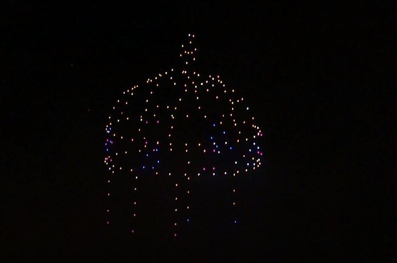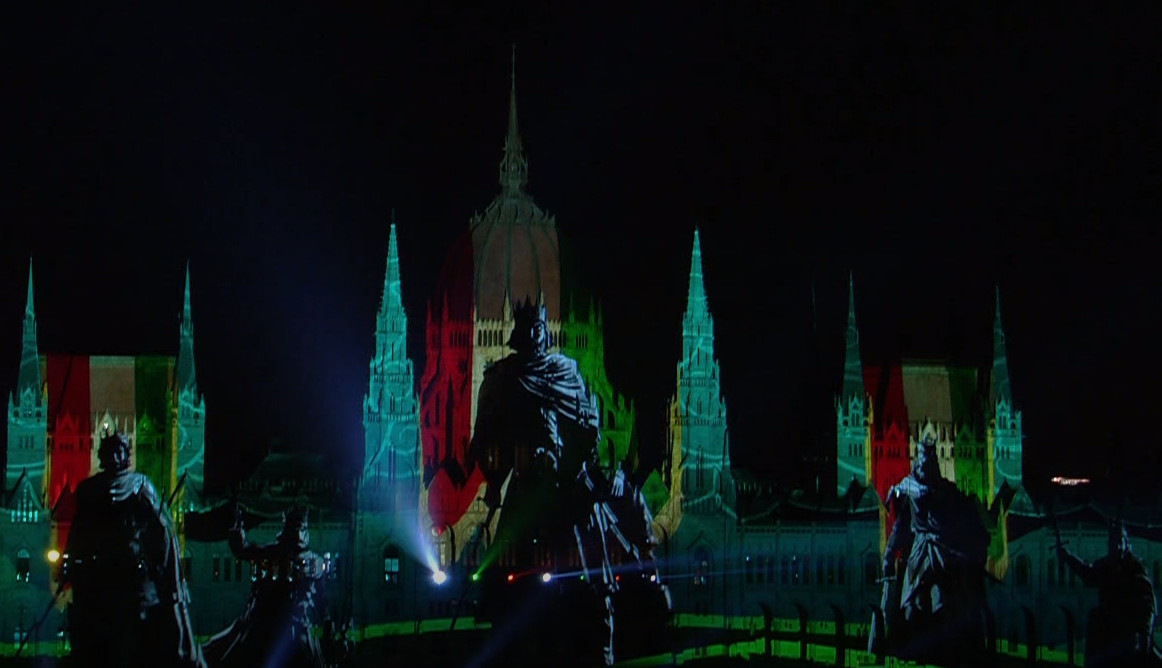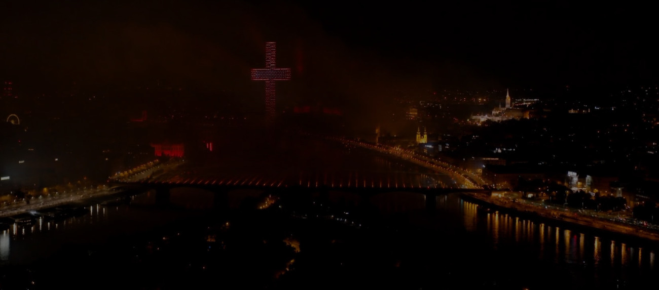 A drón-show minden korábbinál látványosabb volt: a Szent Korona emelkedett fel a Duna fölé, majd forgásba kezdett, aztán egy idő múltán átalakult egy hatalmas keresztté,