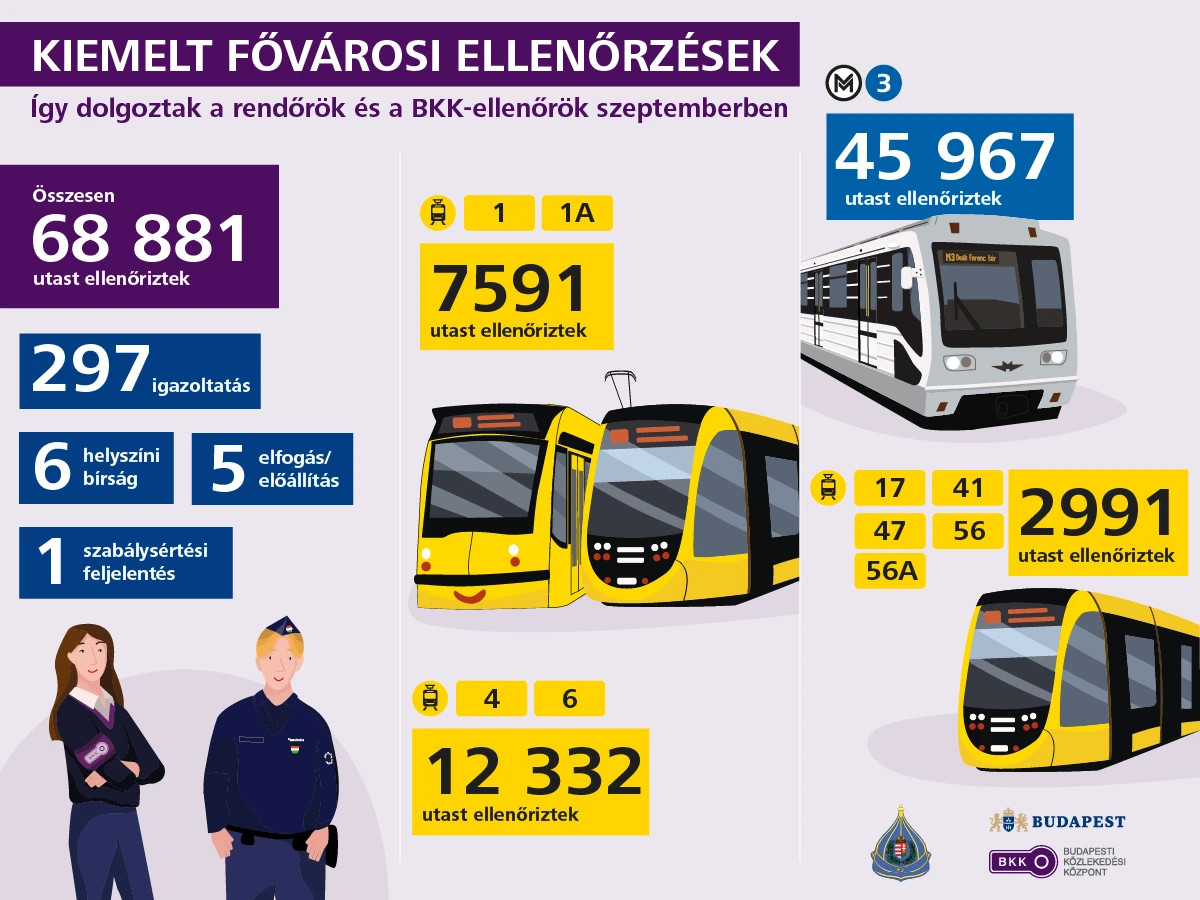 Szeptemberben a 3-as metró vonalán, valamint az 1-es, az 1A, a 4-es, a 6-os, a 17-es, a 41-es, a 47-es, az 56-os és az 56A villamosokon, azok megállóhelyein és az aluljárókban tartottak ellenőrzést – ismertették.