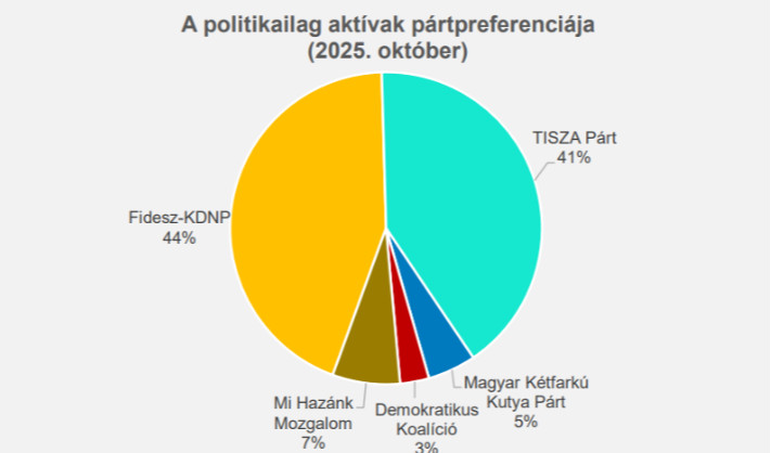 A 21 Kutatóközpont október elején kérdezte az embereket - reprezentatív mintán online és telefonon -, és azt találta, hogy a teljes népességen belül 33:26 arányban vezet a Tisza Párt a Fidesz-KDNP-vel szemben, a most vasárnap biztosan szavazóknál 53:35, a pártot választani tudók körében 48:38 százalék az arány, ami az "idővonalon" ráadásul változatlan, a fideszes aktivitás némileg csökkenhetett. A két erőn kívül a Mi Hazánk kerülhetne még a parlamentbe, 8 százaléknyian szavaznának most rá. A DK és a Kutyapárt küszöb alatt van - derül ki a 24.hu cikkéből. A két nagy párt között a legkisebb településeken a legnagyobb a verseny, a nagyvárosokban a Tisza Párt fölényesen vezet a felmérés szerint, Budapesten például 45:17-re vezet az ellenzéki párt, az is igaz viszont, hogy a szimpatizánsok egyre nagyobb része bizonytalan abban, hogy a Fidesz vereséget szenved jövő tavasszal.