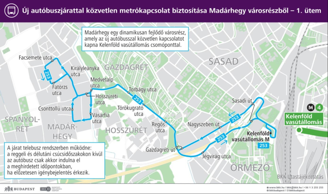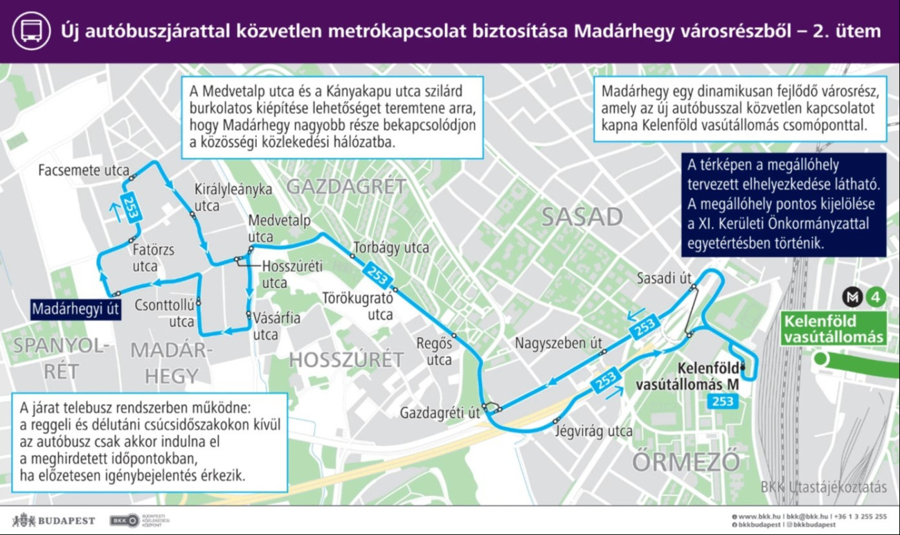 A Budapesti Mobilitási Terv célja, hogy minden városrész elérhető és jól szervezett közösségi közlekedési hálózattal rendelkezzen. Ennek részeként a BKK új, 253-as jelzésű autóbusz elindítását tervezi, amely közvetlen kapcsolatot teremtene Madárhegy és Kelenföld vasútállomás (M4-es metró) között.