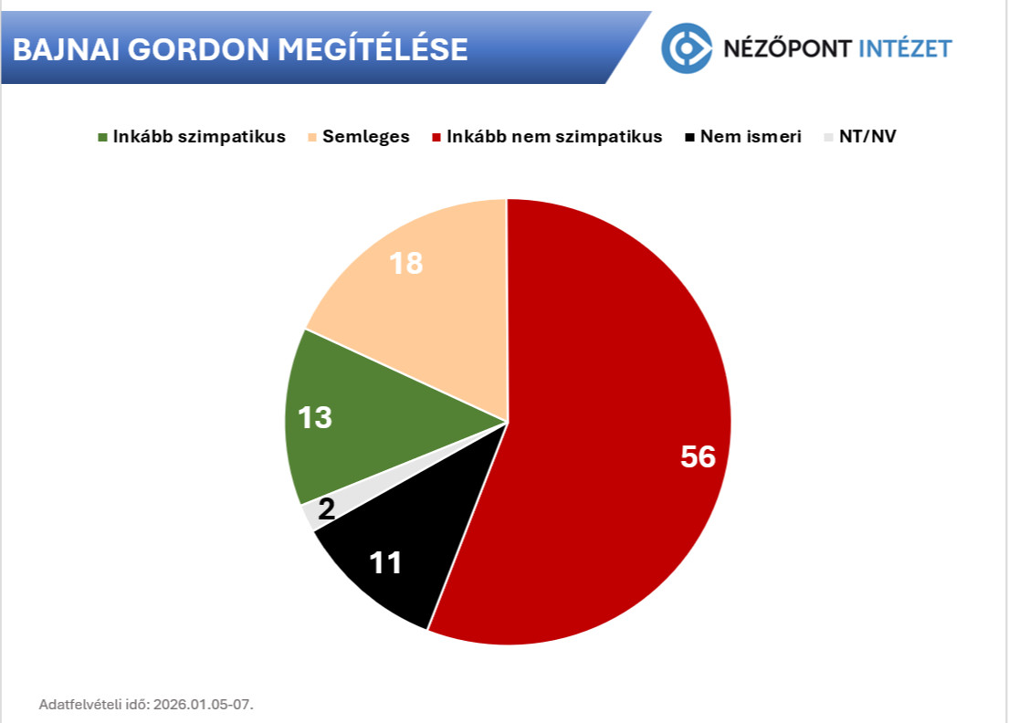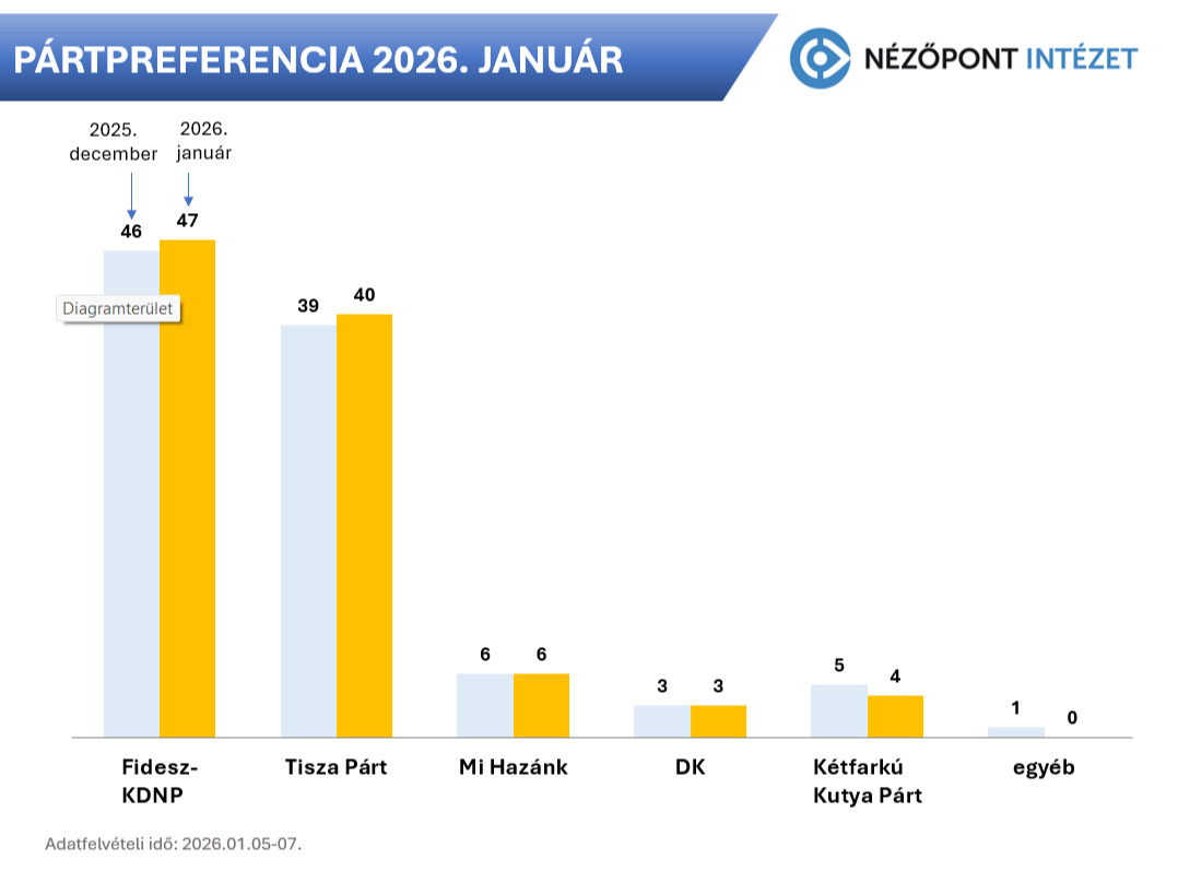 A Fidesz-KDNP egy most vasárnapi választáson a listás szavazatok 47, a Tisza Párt pedig 40 százalékát kapná meg. Harmadik pártként a Mi Hazánk jutna be a parlamentbe, 6 százalékos eredménnyel – derül ki a Nézőpont Intézet január 5, és 7. között, ezer ember telefonos megkérdezésével végzett közvélemény-kutatásából.