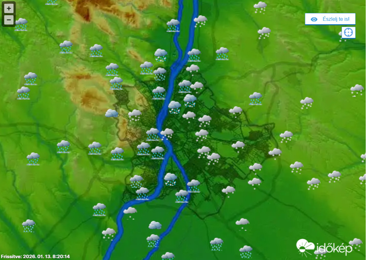 Az Időkép folyamatosan frissülő térképe ónos esőt jelez a IV. és a VI. kerületben, a XV. kerületben, valamint a XII. kerületben, a XI. kerületben, Budaörsön, Budatétényben, Soroksáron. Váltakozva fagyott eső és ónos eső esik a III. kerületben.