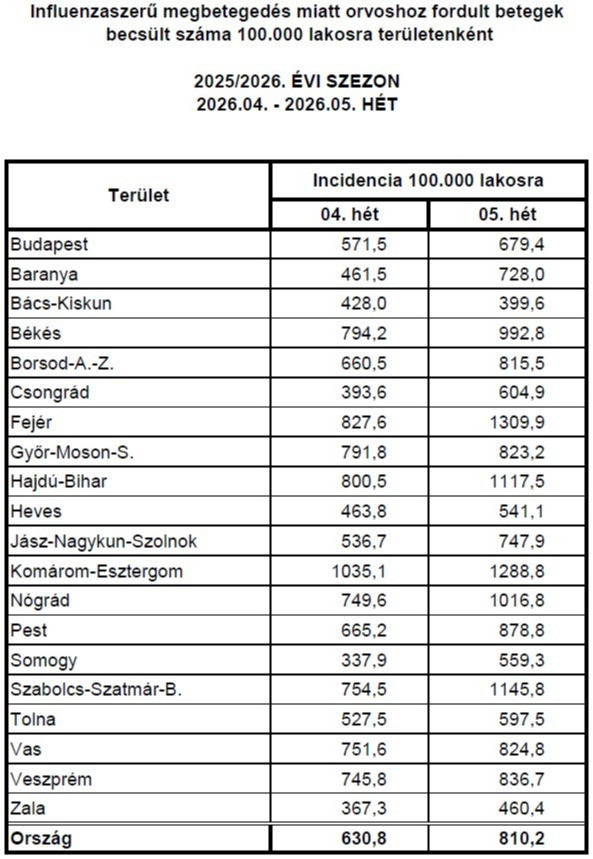 Az 5. héten Bács-Kiskun és Győr-Moson-Sopron vármegye kivételével valamennyi közigazgatási területen nőtt az influenzás tünetekkel orvoshoz fordulók száma az előző héthez viszonyítva. A legtöbb beteg Fejér, Komárom-Esztergom és Szabolcs-Szatmár-Bereg vármegyében volt, a legkevesebb Bács-Kiskun, Zala és Heves vármegyében.