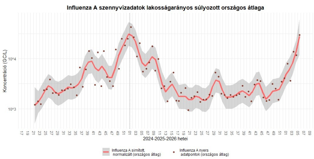 A szennyvízvizsgálatok alapján az Influenza A örökítőanyag koncentrációja országos átlagban emelkedik. Az 5. naptári héten 17 ellátási terület (Békéscsaba, Budapest Dél-pesti és Központi Szennyvíztisztító Telep, Budapest agglomerációjába tartozó települések egyesített mintája, Eger, Győr, Kaposvár, Miskolc, Nyíregyháza, Pécs, Székesfehérvár, Szekszárd, Szolnok, Szombathely, Tatabánya, Veszprém és Zalaegerszeg) esetében volt kimutatási határ felett az Influenza A örökítőanyagának mennyisége.