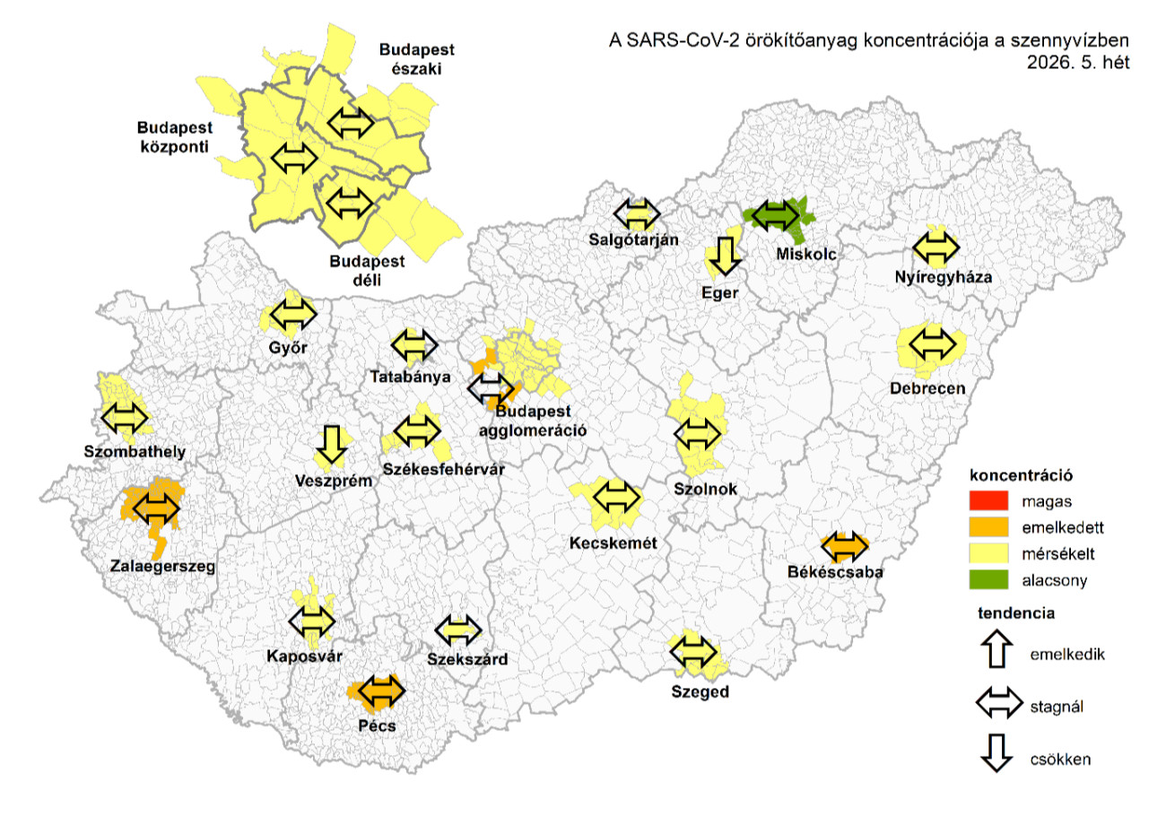 Az év 5. hetében országos szinten stagnált a koronavírus örökítőanyagának átlagkoncentrációja a szennyvízben. Az NNGYK adatai szerint az év 5. hetében 20 ellátási területen stagnálást tapasztaltak, csökkenést figyeltek meg Egerben és Veszprémben, míg emelkedést sehol nem mértek.