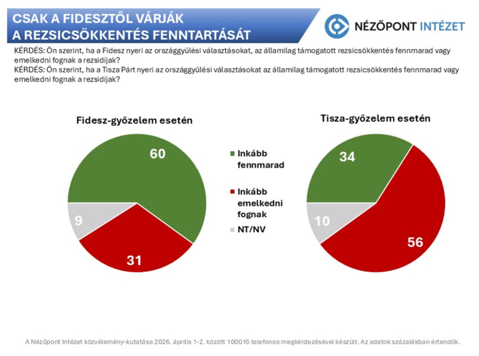 A Nézőpont Intézet közvélemény-kutatása szerint a felnőtt népesség többsége (56 százalék) nem hisz Magyar Péternek és egy Tisza-kormány esetén a rezsidíjak emelkedését várja. A magyarok szinte ugyanilyen mértékben (60 százalék) gondolják azt, hogy választási győzelme esetén a Fidesz viszont fenntartaná a rezsicsökkentést.