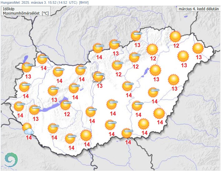 Kedden a ködfoltok gyorsan feloszlanak. Napos idő várható, az északnyugati, nyugati tájakon lehet több fátyolfelhő az égen. Csapadék nem lesz. Gyenge vagy mérsékelt marad a légmozgás. A legmagasabb nappali hőmérséklet 10 és 15 fok között alakul - derül ki a HungaroMet előrejelzéséből.