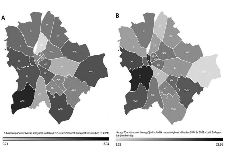kevésbé csökkent a jobboldaliak aránya azokban a kerületekben, ahol magasabb volt a szelektív hulladék aránya, ami arra utal, hogy a fővárosban környezettudatosabbak a jobboldali szavazók.