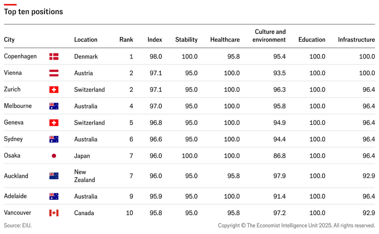 A "Global Liveability Index 2025" rangsor első helyét a dániai Koppenhága szerezte meg, a város 100 ponttal a maximális eredményt érte el a stabilitás, az oktatás és az infrastruktúra terén, és ezzel a tavalyi második helyéről lépett az elsőre. Bár Bécs a legtöbb kategóriában jól teljesített, a stabilitás kategóriában jelentősen csökkent a pontszáma.