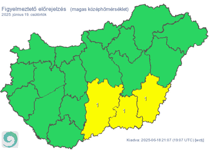 A napi középhőmérséklet 25 Celsius-fok felett alakulhat több déli vármegyében, ezekre citromsárga, elsőfokú figyelmeztetést adott ki a HungaroMet.