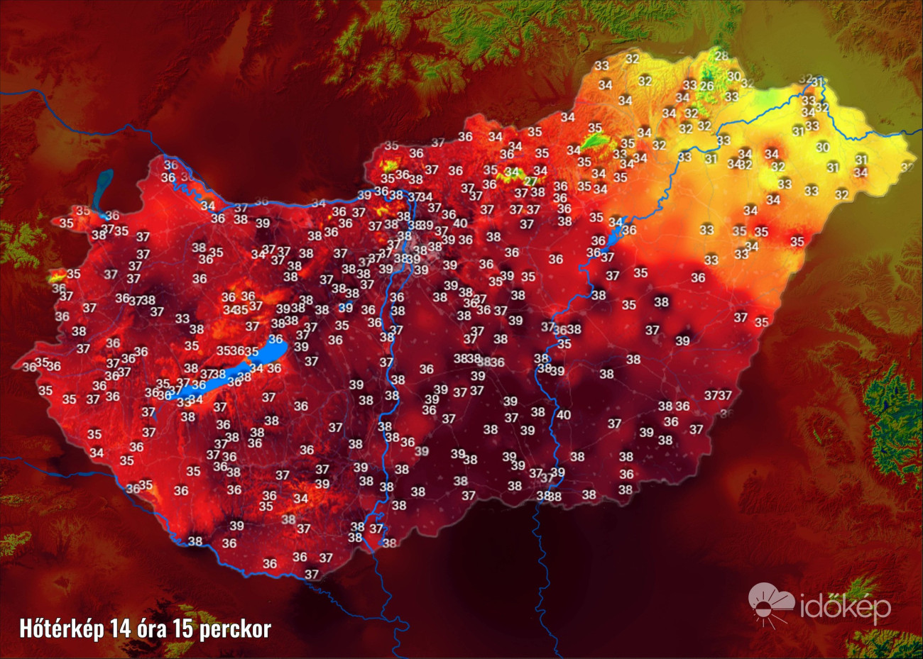 Sokfelé 38 Celsius-fok körül alakul a hőmérséklet az év eddigi legmelegebb napján, ez látszik az Időkép délután negyed háromkor készült pillanatképén.