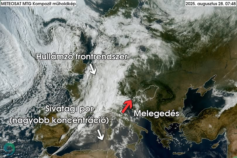 Nyugat-Európa felett egy hullámzó frontrendszer helyezkedik el, amely a hétvégén hozzánk is megérkezik. Előterében délies áramlással ma és holnap még meleg levegő érkezik fölénk, emiatt 30 fok felett alakulnak a maximumok. Ezen kívül sivatagi por is jön délnyugat felől, a jelenlegi műholdképeken a magasabb koncentráció nagyon szépen látható Szardínia közelében – írta előrejelzésében a HungaroMet.