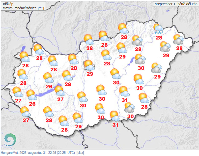 Hétfőn a pára, köd feloszlása után az ország nyugati felén kevés, keleten több gomolyfelhő képződik, de alapvetően sokat fog sütni a nap. Az északkeleti, keleti tájakon néhány zápor kialakulhat. A déli, délnyugati szél elsősorban a Dunántúlon élénkül meg. A legmagasabb nappali hőmérséklet 26 és 32 fok között valószínű.