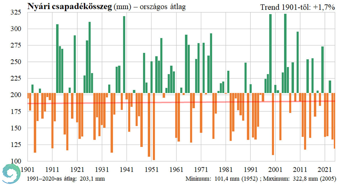 Az elemzés szerint az évszak csapadékösszege az előzetes adatok alapján országos átlagban 119,0 milliméter volt, ami az 1991-2020 közötti évek 203,1 milliméteres átlagának csupán 59 százaléka, így ez a nyolcadik legszárazabb nyár volt 1901 óta.