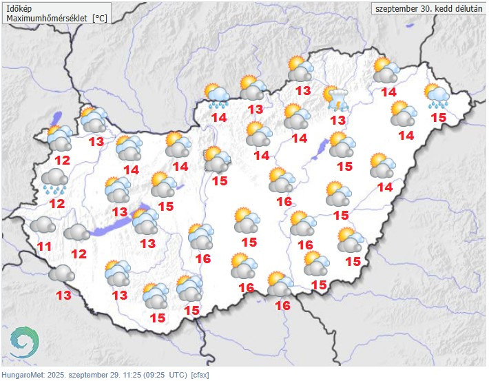 Szerdán közepesen vagy erősen felhős időre van kilátás szórványosan záporral, de egy-egy helyen zivatar is lehet. Az északi, északkeleti szél megélénkül, néhol megerősödik. A hőmérséklet hajnalban 0, +9, délután 12, 16 fok között alakul.