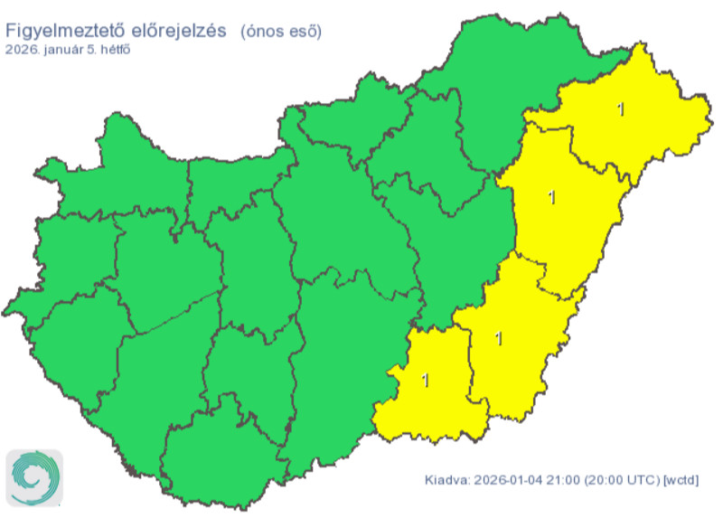 Hétfő délelőtt északon is megvastagszik a felhőzet, országszerte borult lesz az ég, és dél felől egyre többfelé várható havazás. Az ország nagy részén képződik mérhető hóréteg, vastag hótakaró elsősorban a déli országrészben alakul ki. A délkeleti, keleti határ közelében vegyes csapadék, valamint ónos eső is valószínű. Az északi, északkeleti szél helyenként megélénkül. A legmagasabb nappali hőmérséklet mínusz 3 és plusz 2 fok között várható.
