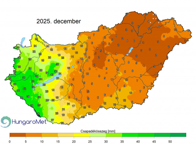 Arról is írtak, hogy az anticiklonos idő miatt a 2025-ös év utolsó hónapjában kevés csapadék hullott, a havi csapadék országos átlagban – az eddig beérkezett adatok alapján – csupán 13,8 milliméter, ami 70 százalékkal elmarad az 1991–2020 közötti évek 45,6 milliméteres átlagától, és ezzel a tízedik legszárazabb december 1901 óta.