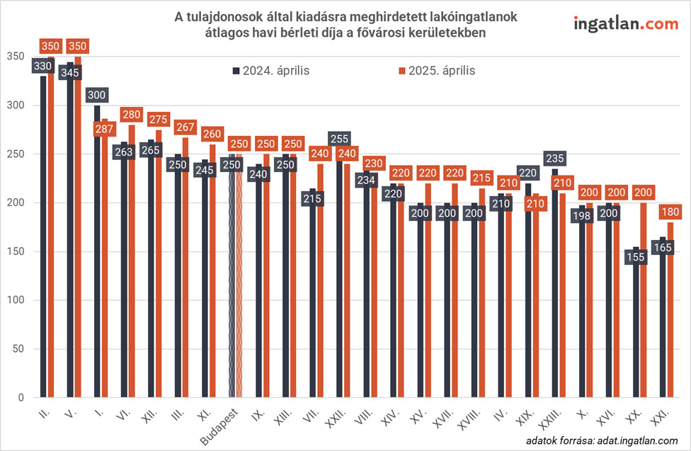 Az ingatlan.com adatai szerint április első másfél hetében a XIII. kerületben volt a legtöbb elérhető kiadó lakás, az átlagos bérleti díj 250 ezer forintot tett ki. A második legszélesebb választékot a XI. kerület nyújtja 260 ezres átlagárral, a harmadik pedig a VI. kerület, ám ott 280 ezer forint a kiadó ingatlanok középértéke. Csepel a legolcsóbb, 180 ezer forintos átlagos bérleti díjjal.