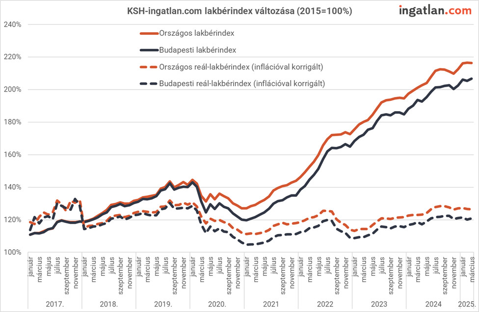 A KSH-ingatlan.com márciusi lakbérindexe szerint a fővárosi lakbérek 0,7 százalékkal emelkedtek februárhoz képest, országos szinten 0,1 százalékos volt a drágulás, ami lényegében stagnálás, éves összevetésben a budapesti 6,7 százalékos növekedést országosan 7,6 százalékos drágulás kísérte márciusban - közölte az ingatlan.com.