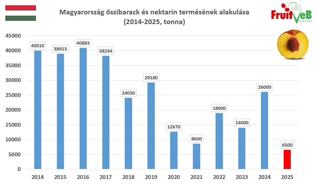 Ezek miatt 2025-re az előző évi 26 ezer tonnának csak a 20-30 százalékát várják, ami mindössze 5000 és 8000 tonna közé tehető abban az esetben, ha már semmilyen extrém helyzet nem következik be. Ahogy a kajszinál is, a ténylegesen betakarított mennyiséget még itt is kissé befolyásolhatja pozitív irányba a gyümölcsméretek növekedése (a gyenge termés miatt az egyedi gyümölcstömeg javul), de negatív változást eredményezhet egy, a hideghatás miatti erőteljesebb gyümölcshullás (ami a szüretig bármikor bekövetkezhet), az esetleges vihar- és jégkárok, vagy egy szélsőségesen aszályos időszak.