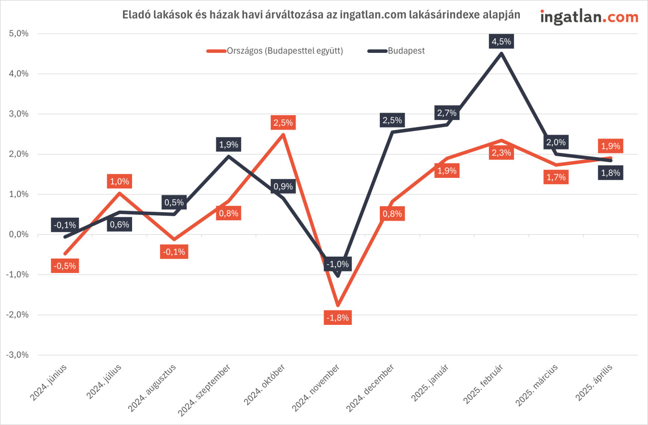„A budapesti lassulásra a havi adatok utalnak elsősorban. Országosan és a fővárosban is 2 százalék alatti drágulás jellemezte az áprilist, miközben Budapesten az idén 4 százalék feletti áremelkedésre is volt példa január és február között” – értékelte az adatokat Balogh László, az ingatlan.com vezető gazdasági szakértője.