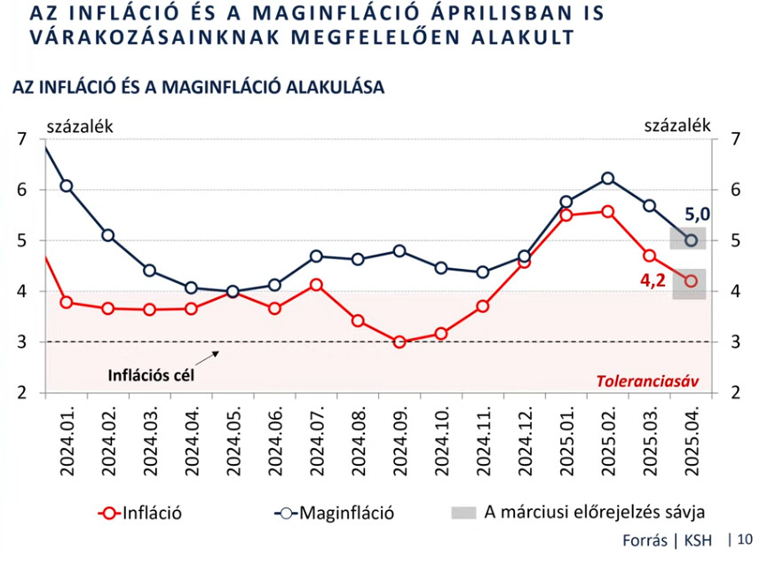 Közölte, várakozásai szerint az infláció a közeli jövőben – hónapokban – a toleranciasáv felső határán mozog majd, de a jegybank elkötelezett a stabil, alacsony infláció mellett.
