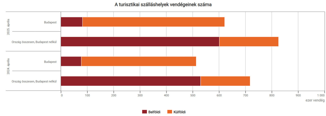 A KSH tájékoztatása szerint 2025. január–áprilisban a turisztikai szálláshelyekre érkezett belföldi vendégek száma 4,1, a külföldieké 18 százalékkal meghaladta az előző év azonos időszakit.
