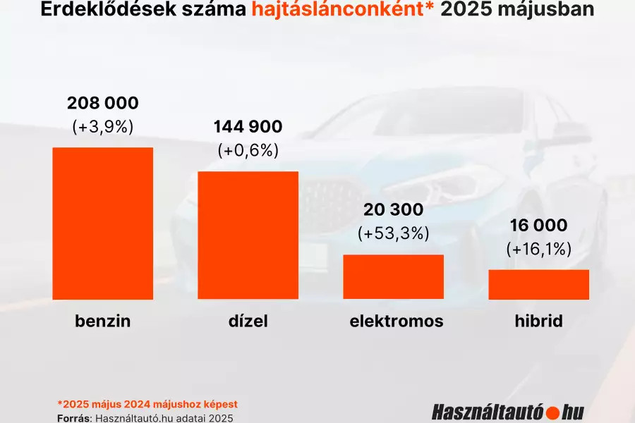 A hasznaltauto.hu brand managere az InfoRádióban elmondta: a hagyományos hajtásláncú autók esetében a benzineseknél 3,9 százalékos, míg a dízeleseknél még kevesebb, mindössze 0,6 százalékos emelkedés tapasztalható a keresletben a 2024-es évhez képest. Az elektromos és hibrid autók iránt viszont nagyon megugrott az érdeklődések száma 2024 májusához képest: