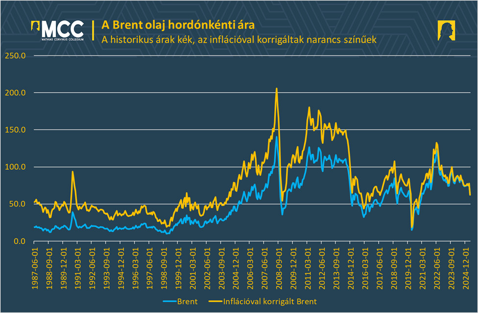 A 2025. májusi adatok szerint a Brent típusú kőolaj hordónkénti ára 62,4 dollár volt. Ez első ránézésre nem tűnik rendkívülinek, de a történelmi kontextus mást mutat: az elmúlt 20 év adatsorában ez a 34. percentilisnek felel meg, vagyis csak minden harmadik hónapban volt ennél olcsóbb az olaj.