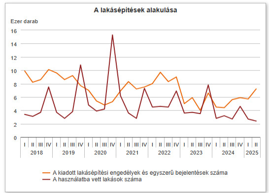 Az első félévében 5129 új lakás épült, 15 százalékkal kevesebb, mint egy évvel korábban. A kiadott építési engedélyek és egyszerű bejelentések alapján építendő lakások száma 12 830 volt, 43 százalékkal több, mint 2024 azonos időszakában - jelentette pénteken a Központi Statisztikai Hivatal (KSH).