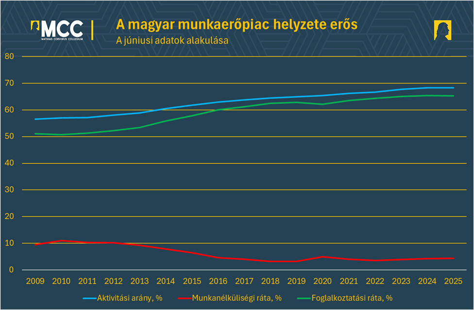 A Központi Statisztikai Hivatal július 25-én közölte a legfrissebb munkaerőpiaci adatokat. 2025. júniusában a gazdaságilag aktívak száma 4,89 millió fő volt, a foglalkoztatottaké 4,68 millió fő, a regisztrált munkanélküliek száma pedig 212 ezer főt mutatott. Ezen értékeket a 7,16 milliós munkaképes korú, azaz 15-74 éves népesség viszonylatában érdemes értelmezni.