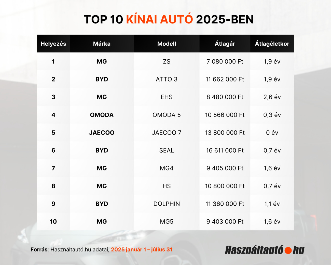 A hasznaltauto.hu üzletágvezetője az InfoRádióban azt mondta, az Omoda 5-ös és a Jaecoo 7-es modellje úgy végzett a népszerűségi listán a negyedik, illetve az ötödik helyen, hogy tavaly sokan még talán nem is tudtak róla, hogy léteznek egyáltalán ilyen autók. Koralewsky Márk úgy fogalmazott, a kínai autómárkák viszonylag fiataloknak számítanak Magyarországon, az átlagéletkoruk jóval alacsonyabb, mint más használt autóké. A Jaecoo 7-es például még egyéves sincs, mégis bekerült a top tízbe. A legidősebb modell egyébként a MG EHS az első tíz között, a maga 2,6 éves átlagéletkorával.